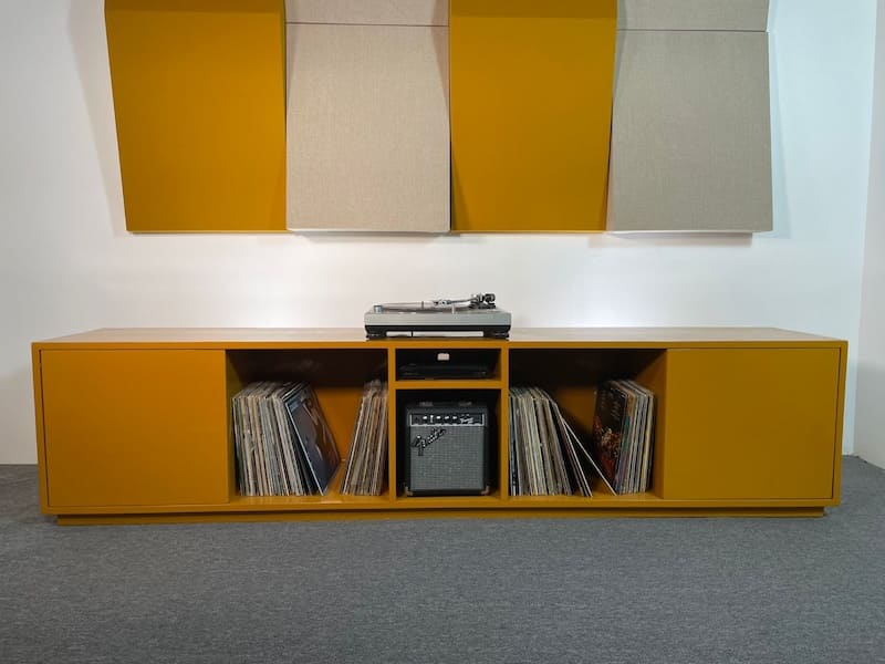 Es una línea de muebles bajos. Ideal para iniciar con tu colección de vinilos y el mundo del audio Hi Fi. Esta línea está diseñada para tu cuarto de TV o Cine en casa.