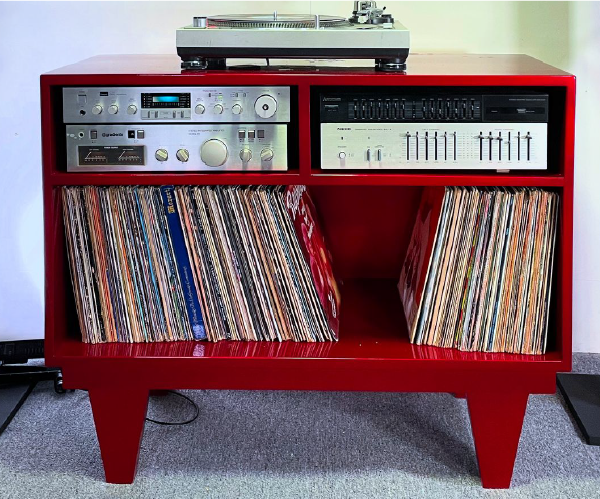 Espacio para 200 vinilos , CDS y amplificador, look retro actualizado con espacio para amplificador y colores personalizados le encontraran un lugar en tu cuarto o departamento.